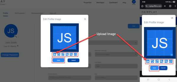 To access your profile page, click "Profile" just under your initials in the top-right of the screen (red rectangle on desktop) or click the blue circle with your initials at the bottom-center of the screen (red square on mobile). On your profile page, you can edit your account information and upload a user image (avatar) that will appear in place of your initials. To upload an image, click on the pencil/edit icon (circled in red in the first screenshot below) then click the first icon on the left (second screenshot). Once your image is uploaded, you have the ability to rotate the image 90 degrees to the left or right, zoom in or out, or reset the image. When you are satisfied with your image, click the blue "Save" button.