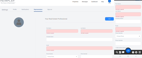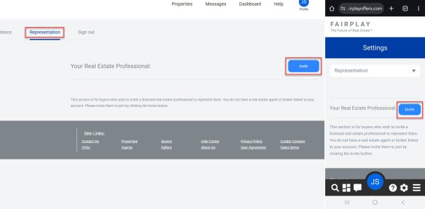 In the "Representation" section you can invite a real estate professional to represent you or even remove them as your representative. To invite your real estate agent, go to the representation page in your profile and click the blue "Invite" button. This will prompt you to type in their name and email address, and a link will be sent to them that will allow them to create an agent profile and represent you.